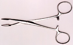 Stainless steel hemostatic forceps with serrated grip at the tips.